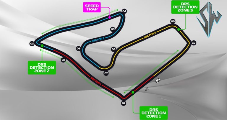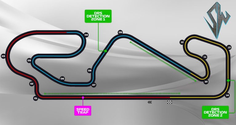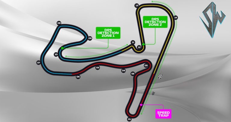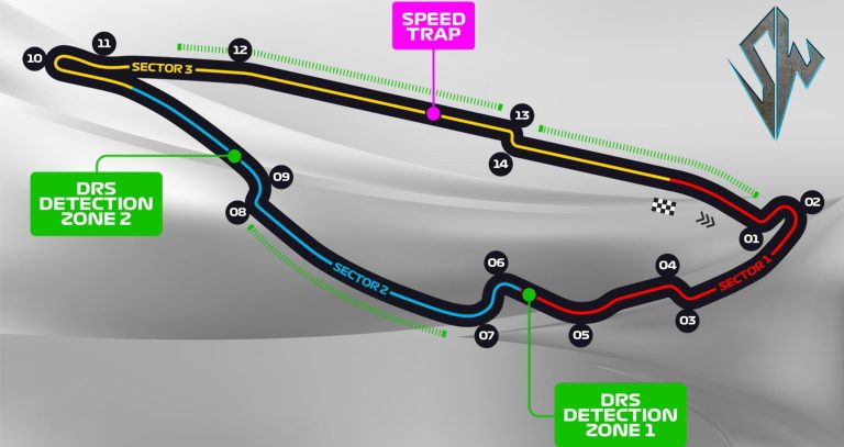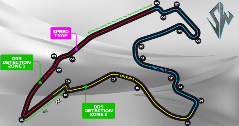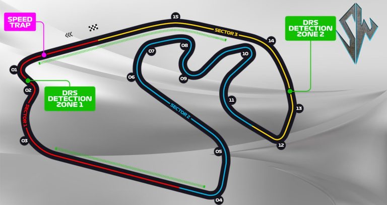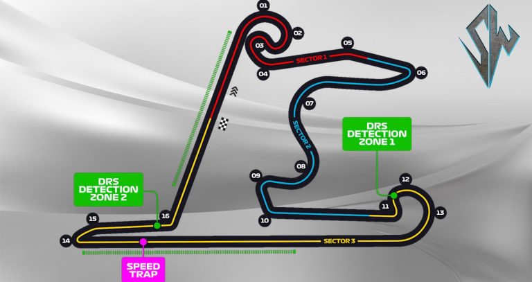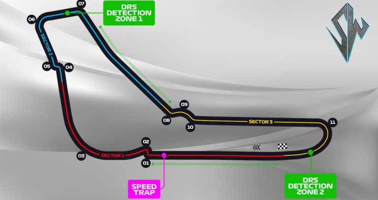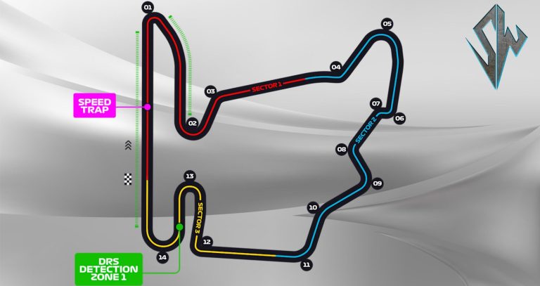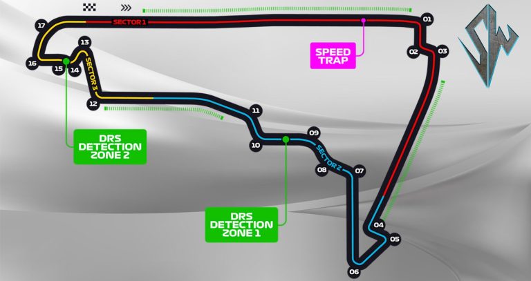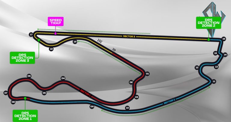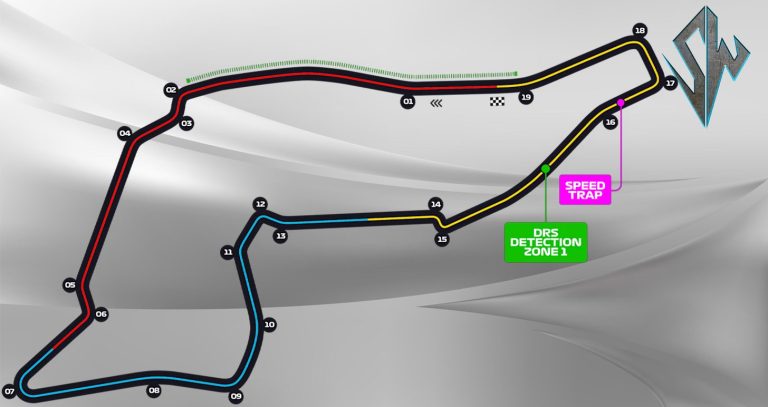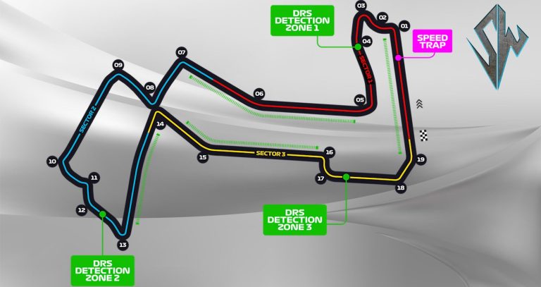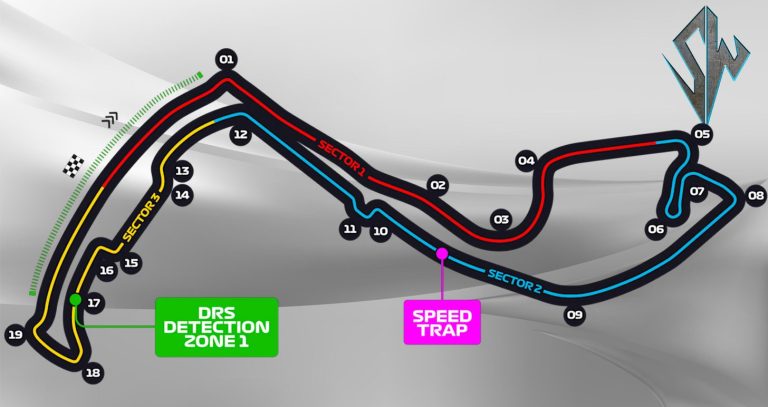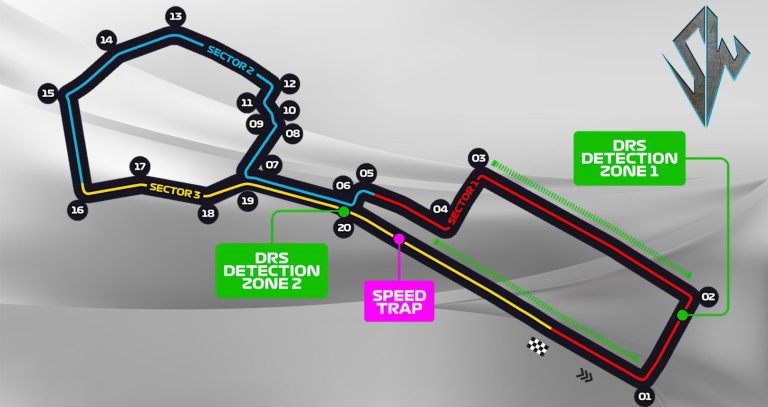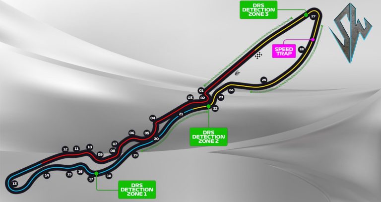 A street-track spectacular. With the Hard Rock Stadium at its epicentre, the 5.41km layout features 19 corners, three straights, three DRS zones, and top speeds of over 350km/h. There are elevation changes too, the main one found between Turns 13 and 16, with the track heading over an exit ramp and under various flyovers across uneven ground. The Turn 14-15 chicane, meanwhile, has an uphill approach, with a crest in the middle, and then drops down on exit.